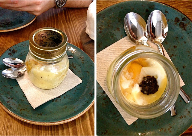 En cuanto a la carta, no es muy grande pero tiene un poco de todo y a buen precio. Hay recomendaciones del restaurante, como por ejemplo el clásico «potito» de huevo poché con parmentier de patata y aceite de trufa, parecido al que sirven en La Gabinoteca y muy muy rico.
