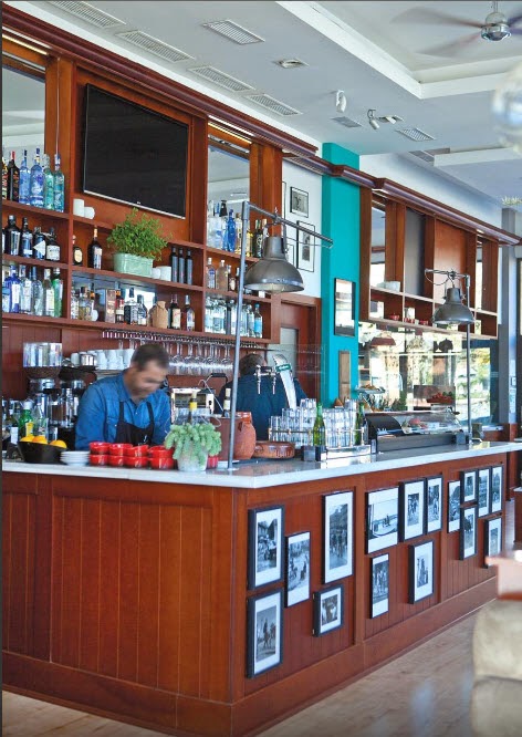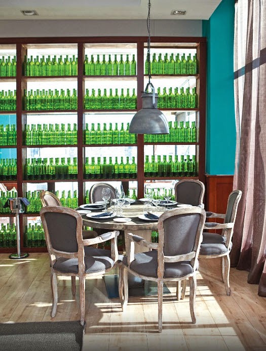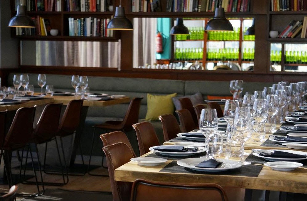 Primero hay un salón informal que combina una barra con mesas altas y bajas. Todas de madera y con sillas industriales. Las mesas están tanto para desayunar, comer o cenar, como para tomarte una copa. Por eso no tienen mantel puesto, si decides comer, te ponen tu mantelito individual, muy práctico.